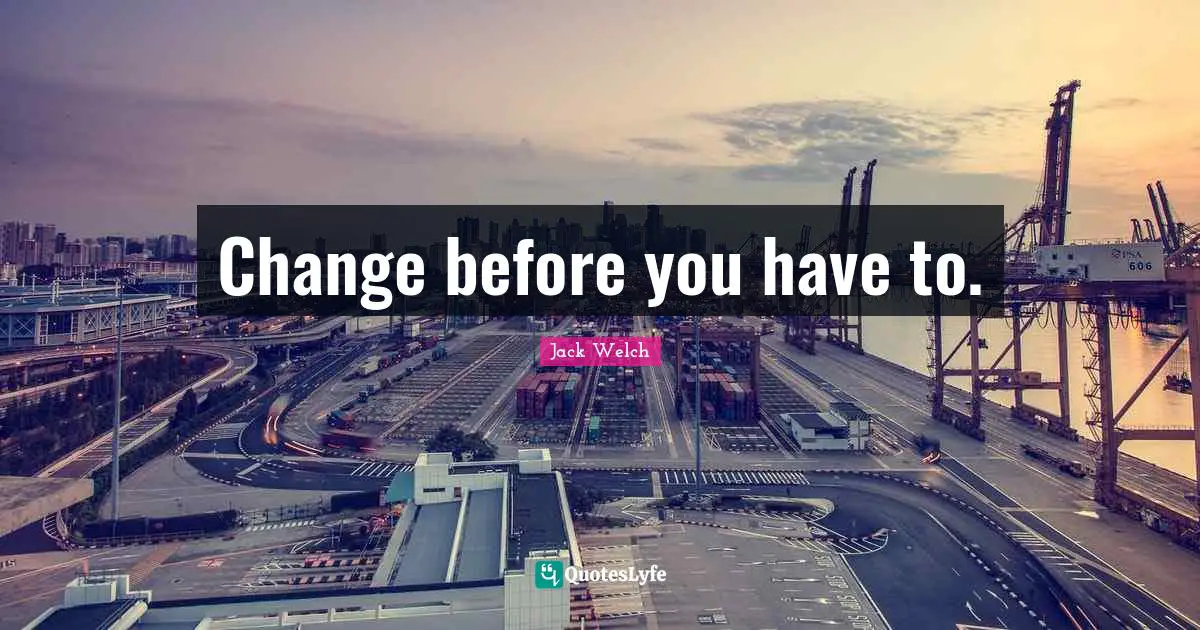 Change Before You Have To 101 Quotes about Change Inspirational quotes about change Change your life today Don't gamble on the future, act now, without delay Positive quotes about change The greatest discovery of all time is that a person can change his future by merely Quotes about"Change before you have to" — Jack Welch "Change brings opportunity" — Nido Qubein "Change in all things is sweet" – Aristotle "Change is inevitable – except from a vending machine" — Robert C Gallagher "Change is the constant, the signal forJack Welch Helpful Not Helpful Don't manage lead change before you have to Votes 3 Jack Welch Helpful Not Helpful Willingness to change is a strength, even if it means plunging part of the company into total confusion for a while Votes 3 Jack Welch